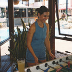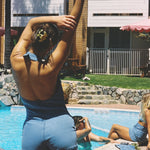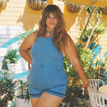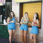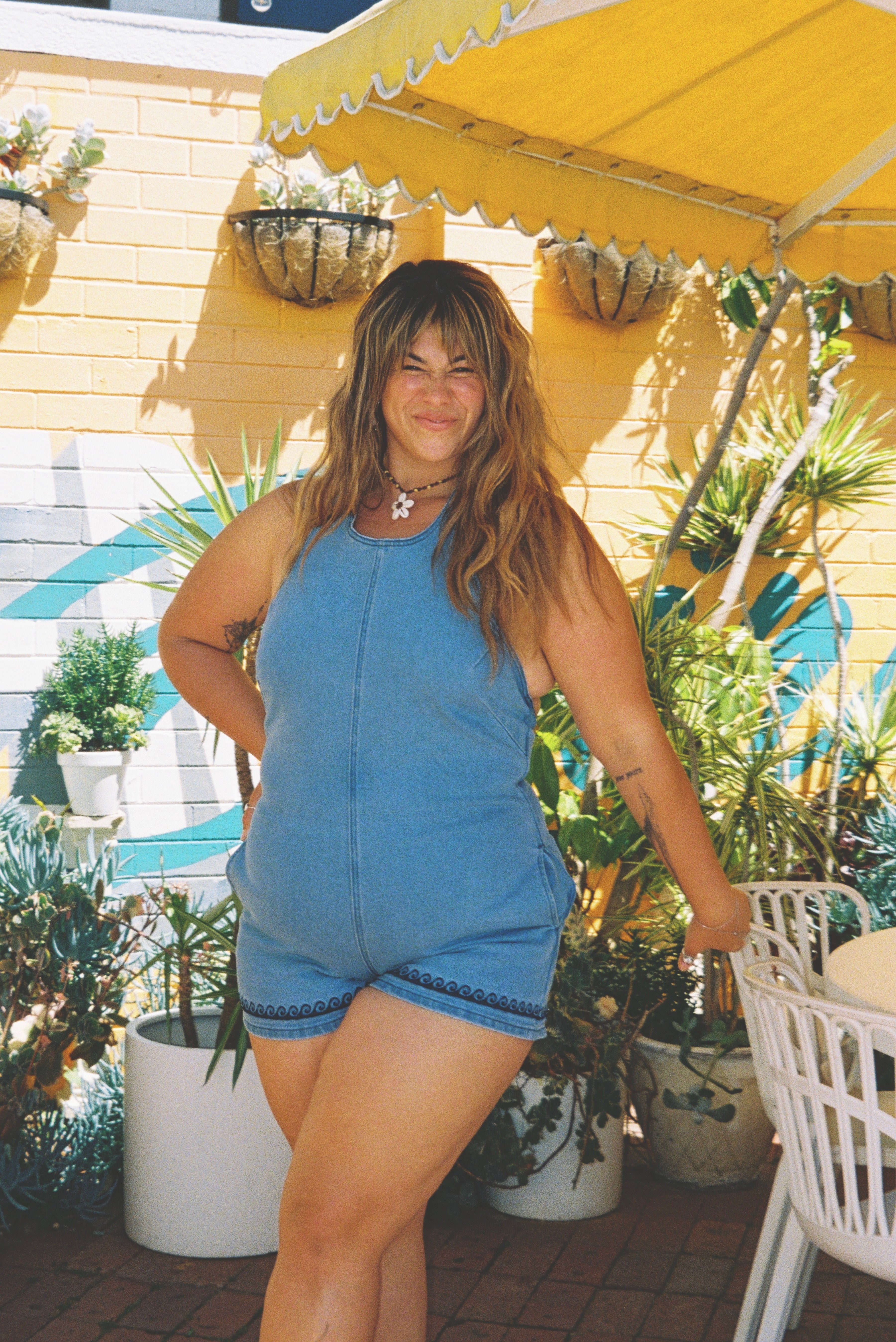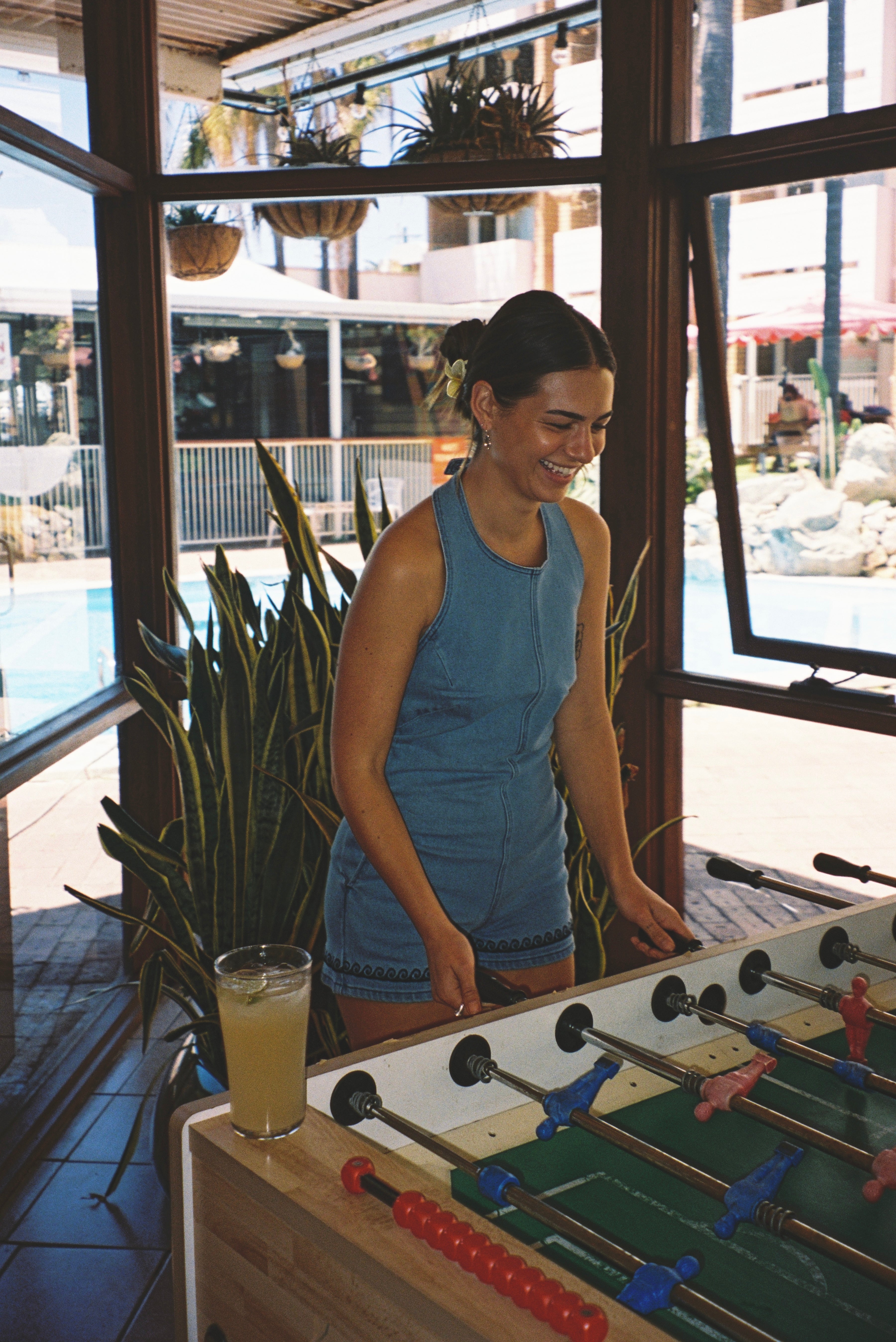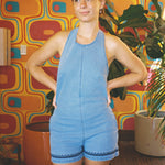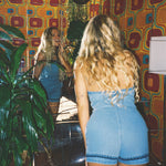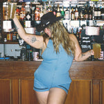 Our gorg Doozy Denim Romper is inspired from a vintage Roxy design which features a halter neck, low back, shorties, our logo wave embroidery detailing, pockets and adjustable neck buttons.