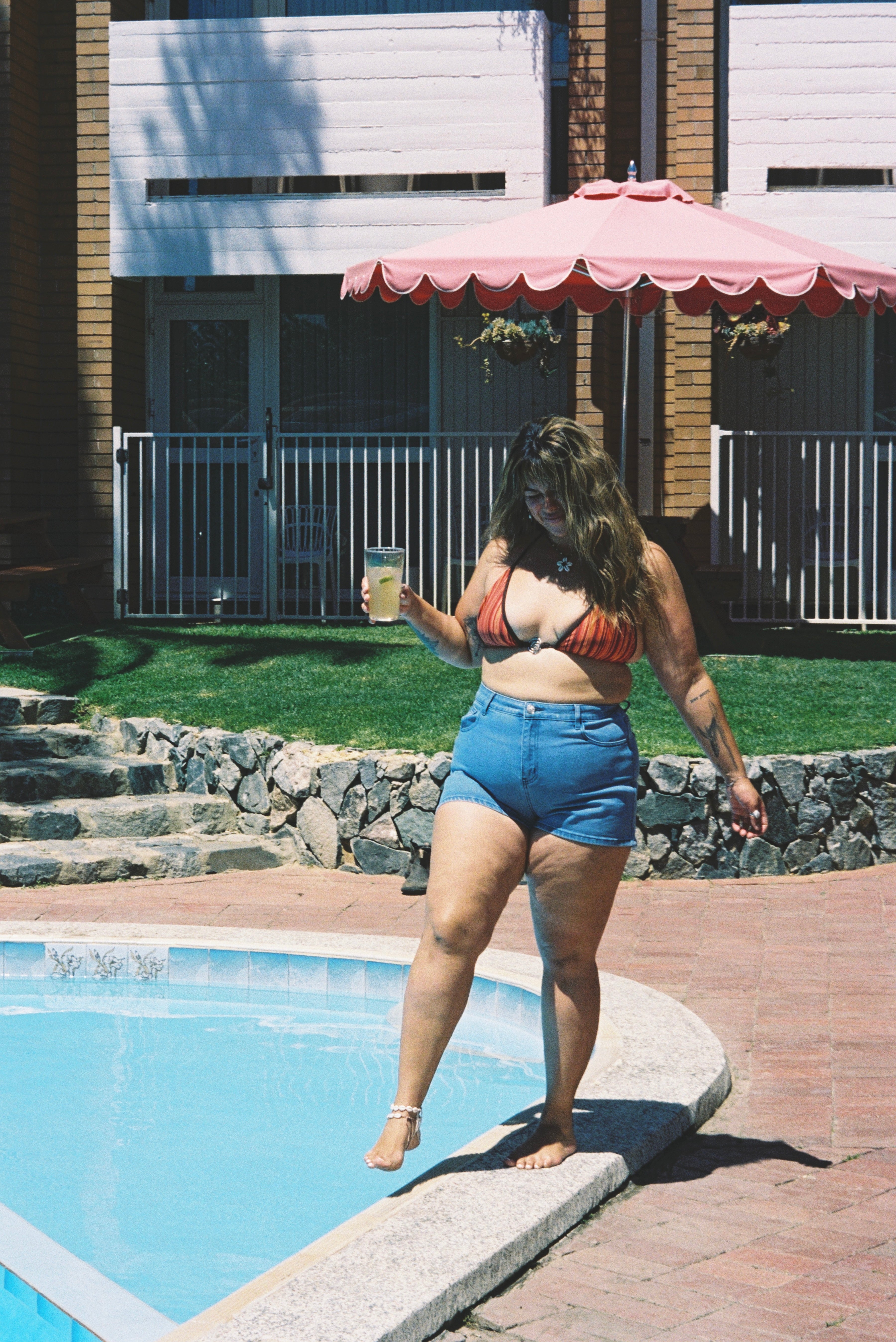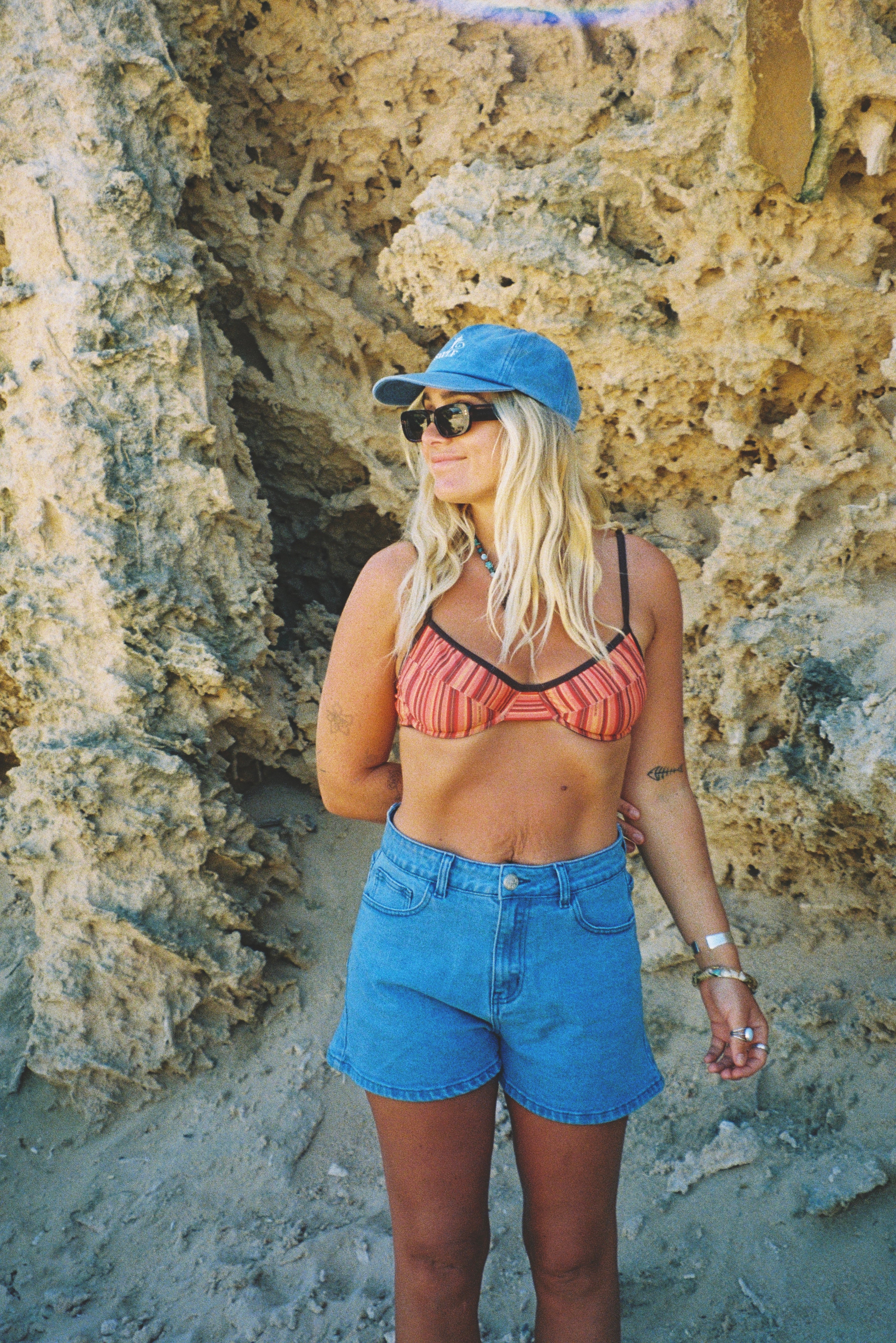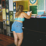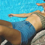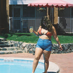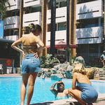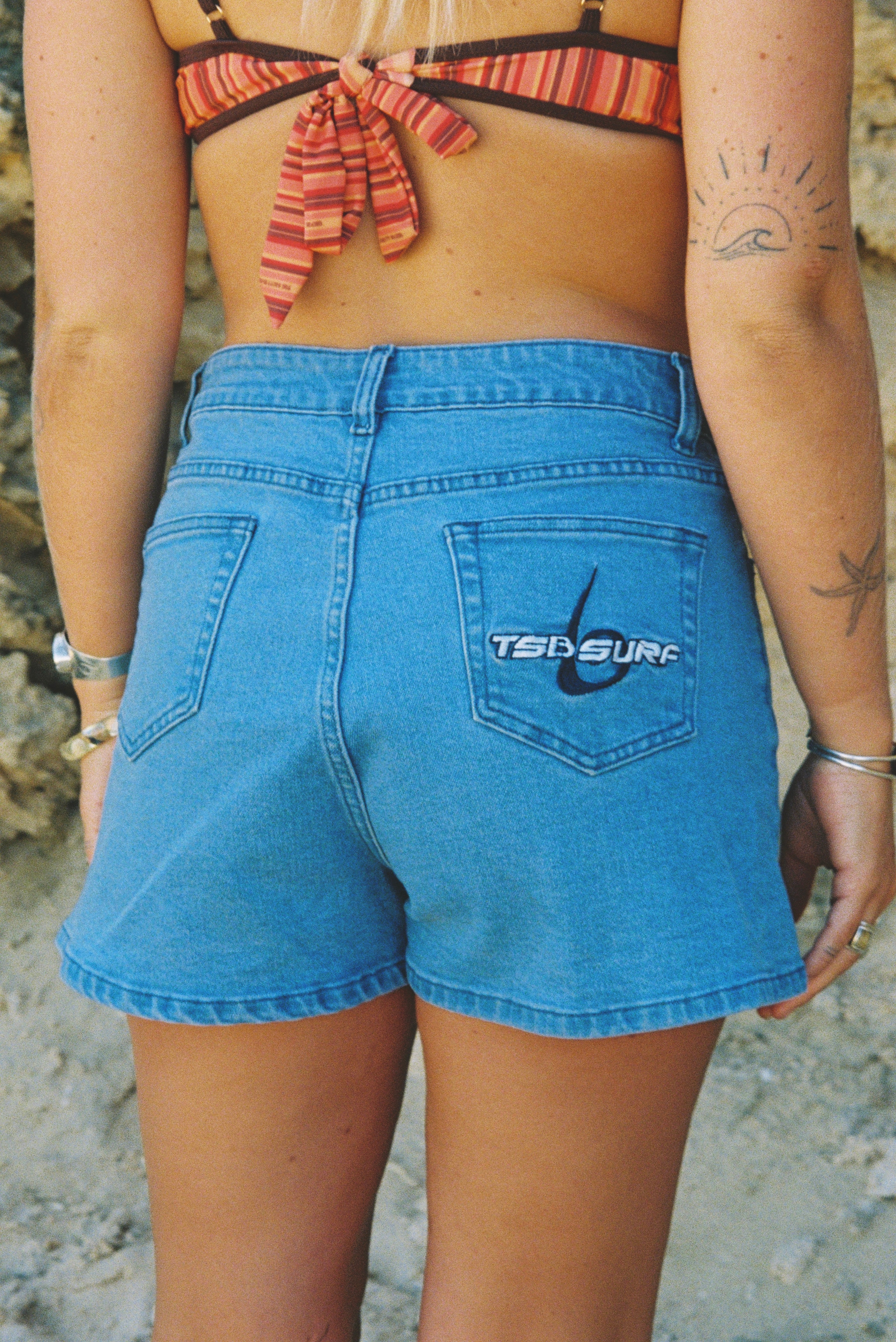 These are a high waisted design and paired perfect with a bikini top, button up shirt, oversized tee or a cute little crop. Please also keep in mind that denim stretches with wear and when washed it will bounce back to its original size.