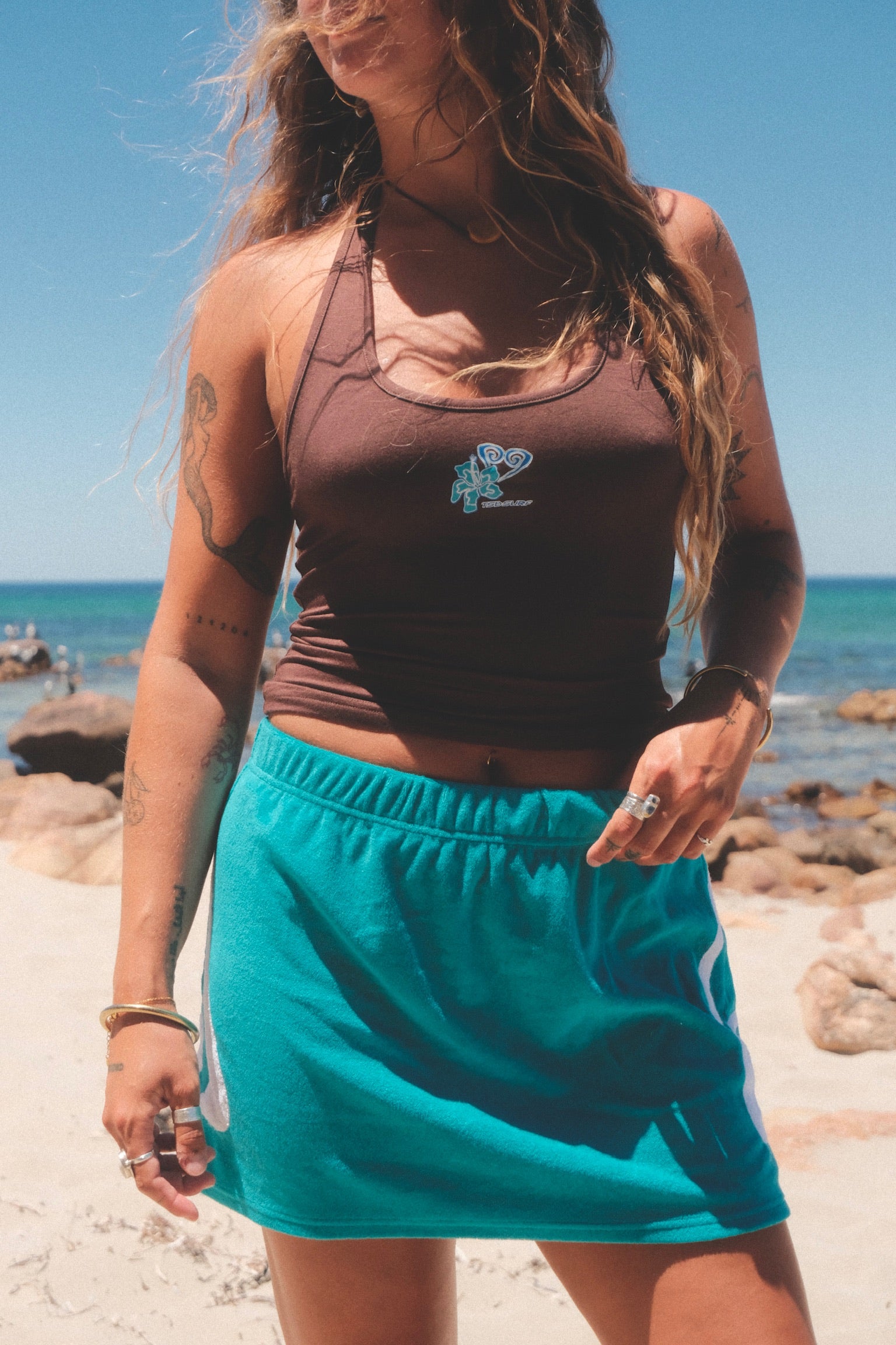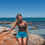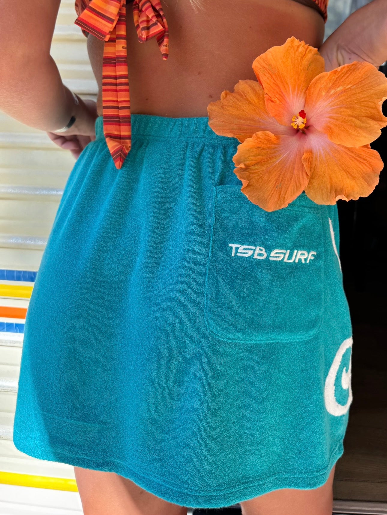 The skirt you need to just chuck on to make any fit cute, girly and surfy!! Made from 100% terry towelling cotton!! A stretchy elastic waist, back pocket and a very flattering shape. Not to mention all the extra hard work that has gone into cutting and sewing on our logo on the sides.