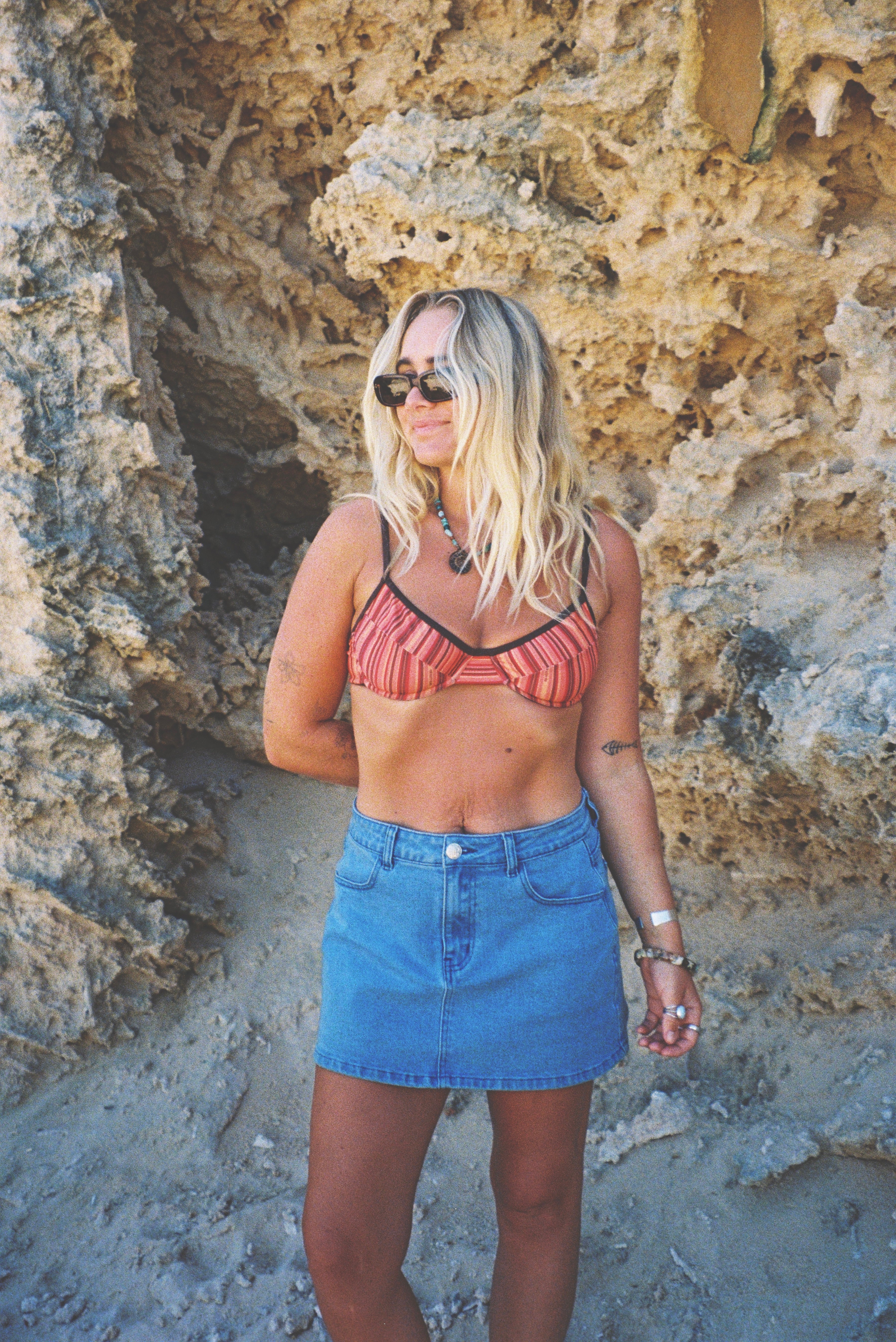 Designed for support and style, the Ochre Bralette features soft paneling, signature brown binding, a tie back, and fully adjustable straps. You can customise the fit to suit your shape.