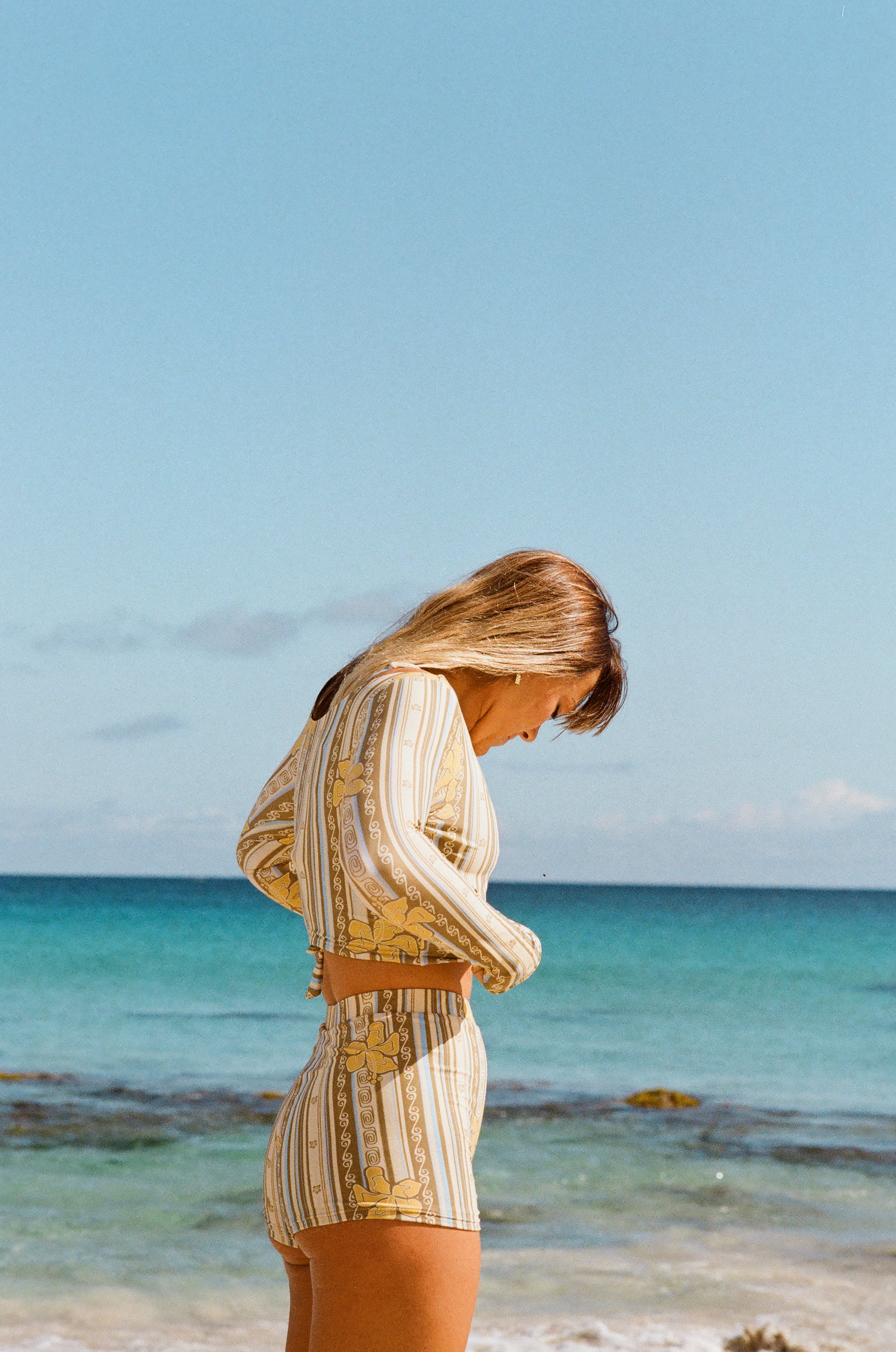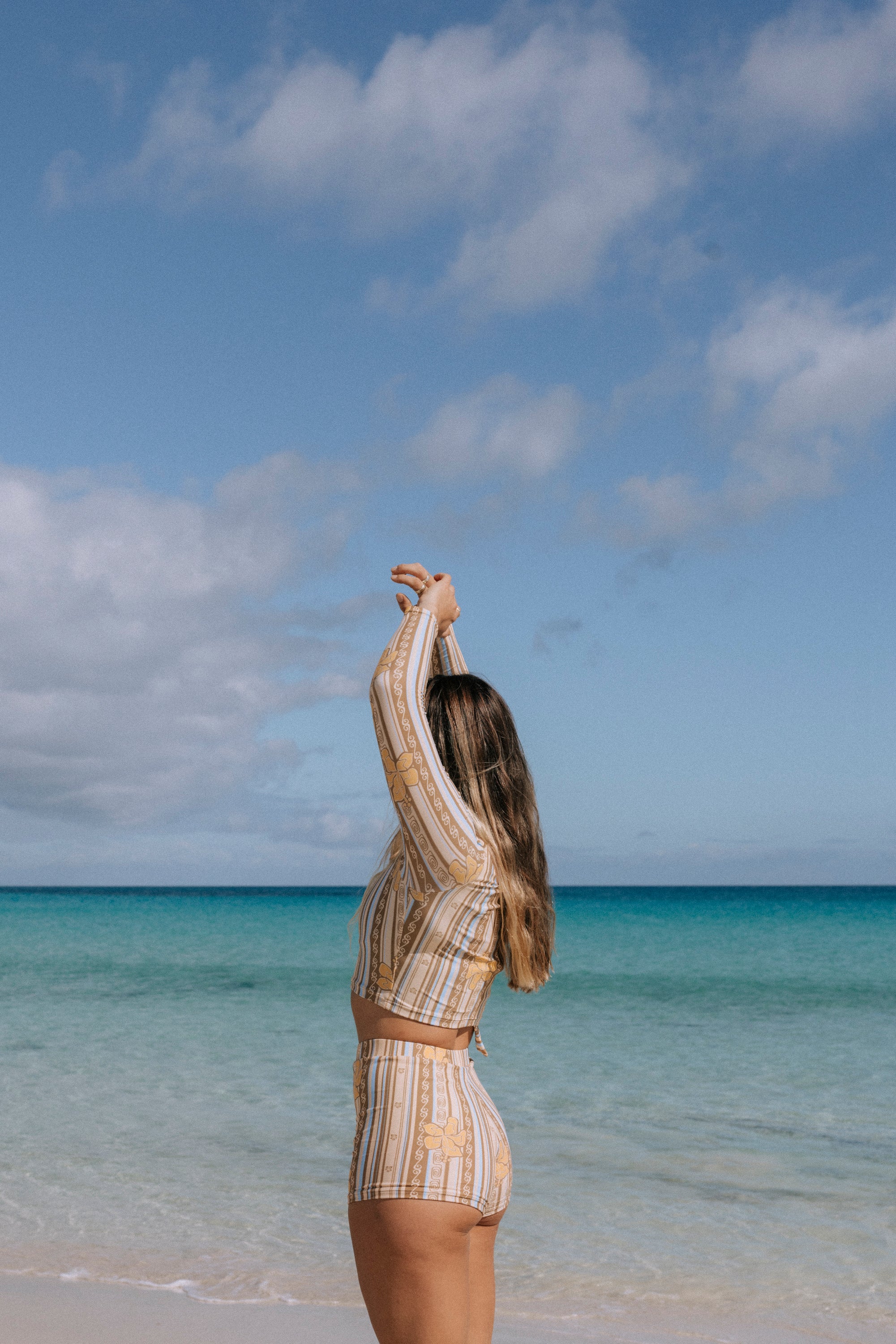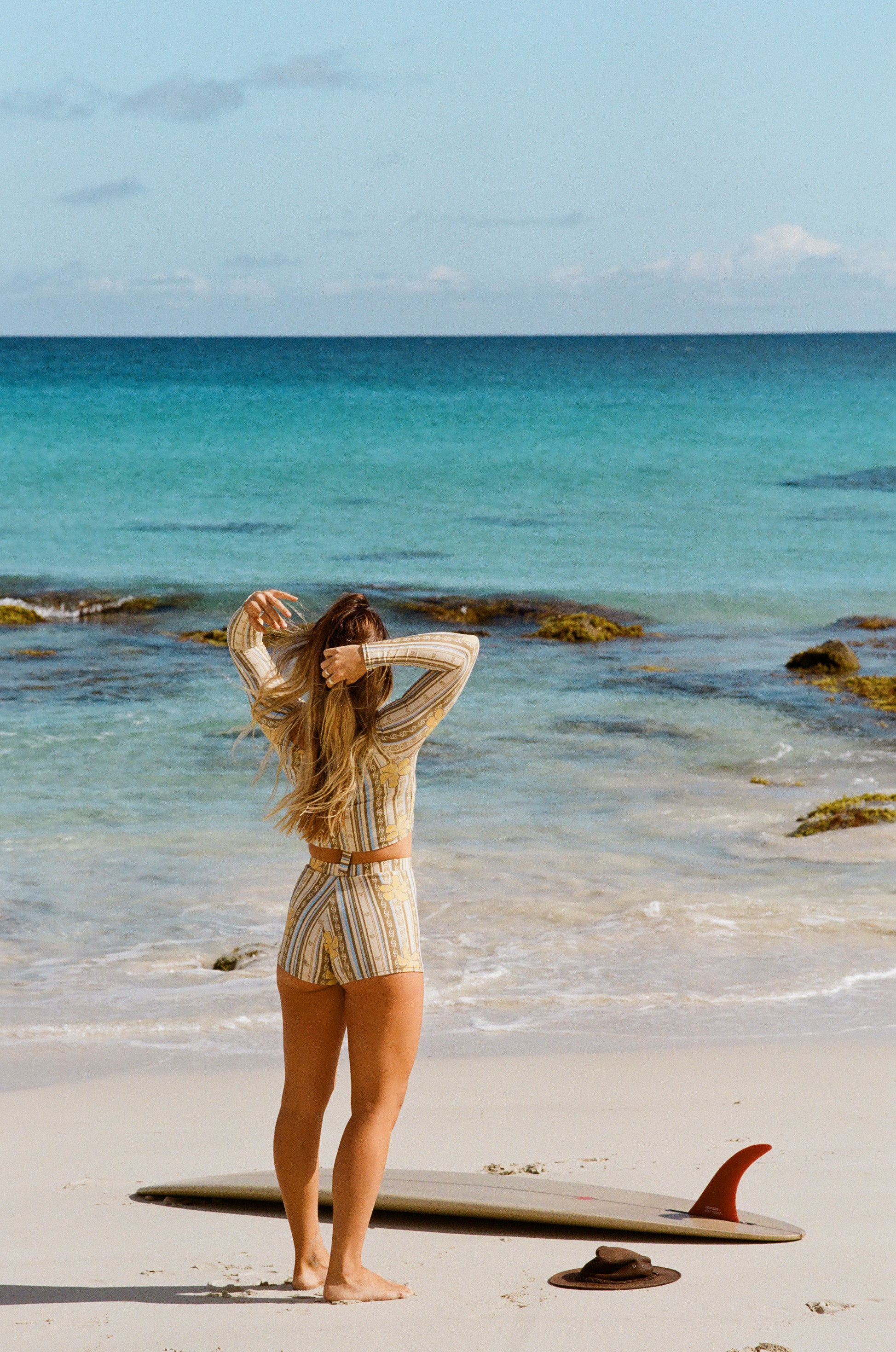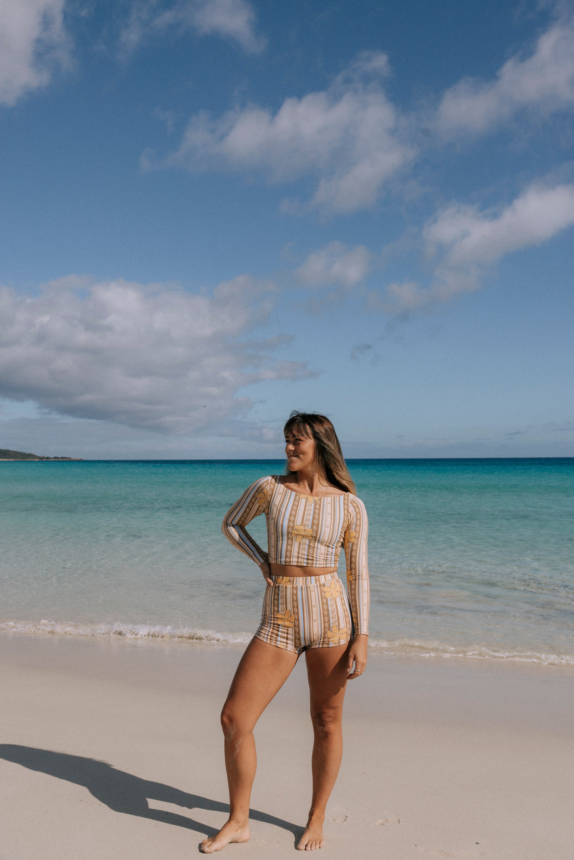 Introducing a new style, our cropped rashie is in our beautiful Sandie print, made from recycled plastic bottles that have been taken out of the ocean and is 50UVP protection for all your adventures!!