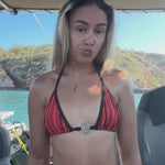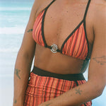 The scrunchable cups let you adjust the coverage to suit your mood - whether you want more or less, it's all in your hands. With our signature halter style, this top embraces the vintage feel while providing all-day support. The custom spiral hardware at the centre adds a unique TSB touch, elevating your look with a little extra flair. Tying at both the neck and back, it gives you the freedom to adjust for a perfect fit based on your bust size, ensuring comfort and confidence no matter the wave. Whether you’re hitting the surf or lounging by the shore, this top is your go-to for a chic, customizable fit.